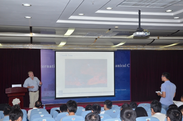 在深入了解实验室的研究工作后,Dennis教授于8月31日上午在新科技楼八楼与段宝岩院士进行长达1小时的交流后,来到北校区图书馆西裙楼报告厅,为公司师生带来了一场题为Structure Design and Current Progress of GBT(Green Bank Telescope)的精彩学术报告。实验室主任黄进教授对Dennis教授的到来表示了热烈欢迎,学术报告会由王从思教授主持。在报告中,他首先对GBT天线结构设计的基本特点、指标参数和近况进行了说明,然后就GBT反射体偏置与副面支撑结构的特殊性,详细论述了天线运行调试后在结构上做出的改进手段和保障技术、轨道的机械维护措施以及高效馈源接收机转动系统等内容。