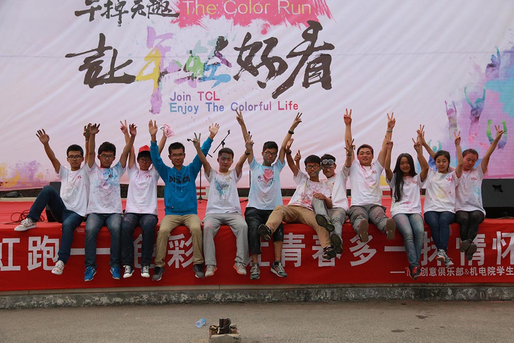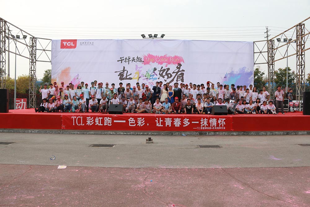 中午,精心布置的舞台,悉心准备的节目早已将参与者的热情点燃。12点30分,在助跑嘉宾的带领下,TCL彩虹跑正式开始,会场顿时变成了色彩的海洋。10支队伍在领跑者的带领下途径6个撒粉点,欢乐地跑完了3.5公里的路程。跑完的同学们在留言板上留下了姓名与愿望,在创意区与游戏区尽情的享受乐趣。2点30分,进行到狂欢环节,台上节目激情四射,台下同学色彩浓艳,彩虹跑的欢乐气氛达到了顶峰。近一个小时的狂欢后,TCL彩虹跑活动完美落幕。