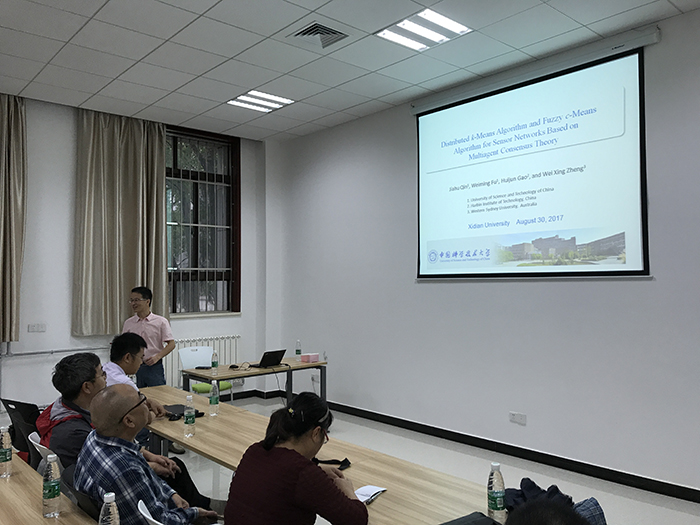 8月30日上午,在北校区主楼三区第三会议室,首先,秦家虎教授作了“Distributed k-Means Algorithm and Fuzzy c-Means Algorithm for Sensor Networks Based on Multi-agent Consensus Theory”的学术讲座,报告会由6776永利集团自控系主任张强教授主持,来自yl6776永利集团官网60余人参加了学术报告会。报告中,秦家虎教授首先介绍了传感器网络系统分布式控制的基本问题,对传感器网络动态、拓扑结构、分布式协议等进行了详细的介绍。重点介绍了传感器网络的分布式K-均值和模糊K-均值算法研究,其中包括问题的提出和建模、聚类定义和中心质点以及更规则等。最后介绍了将来的研究热点和发展趋势。秦家虎教授的报告内容既具有理论上的创新性又紧贴实际工程应用,引起了广大听众的共鸣。最后秦教授现场与广大师生进行了热烈的交流和讨论,他详细解答了每一个提出的问题,到场师生表示受益匪浅。