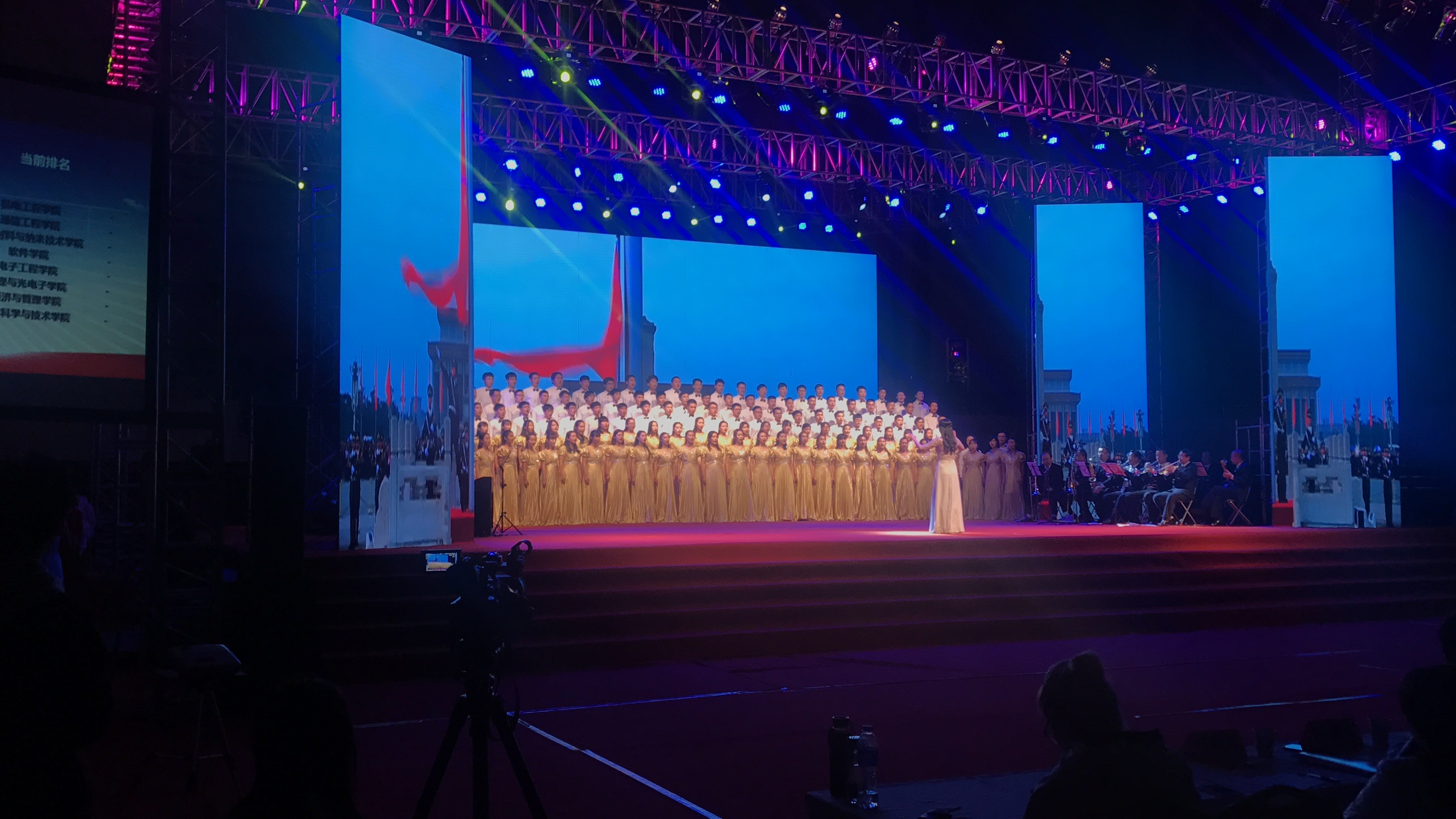 6776永利集团合唱队伍演唱的曲目是《与共和国同行》和《光荣与梦想》,经过一个月的训练,在同学们与带队老师王飞和老师王维佳、石贵利、张育洋的共同努力下,学院合唱队伍精彩的完成了这两首歌曲,气势恢宏、歌声嘹亮、舞蹈动作整齐划一,赢得在场观众的阵阵掌声。