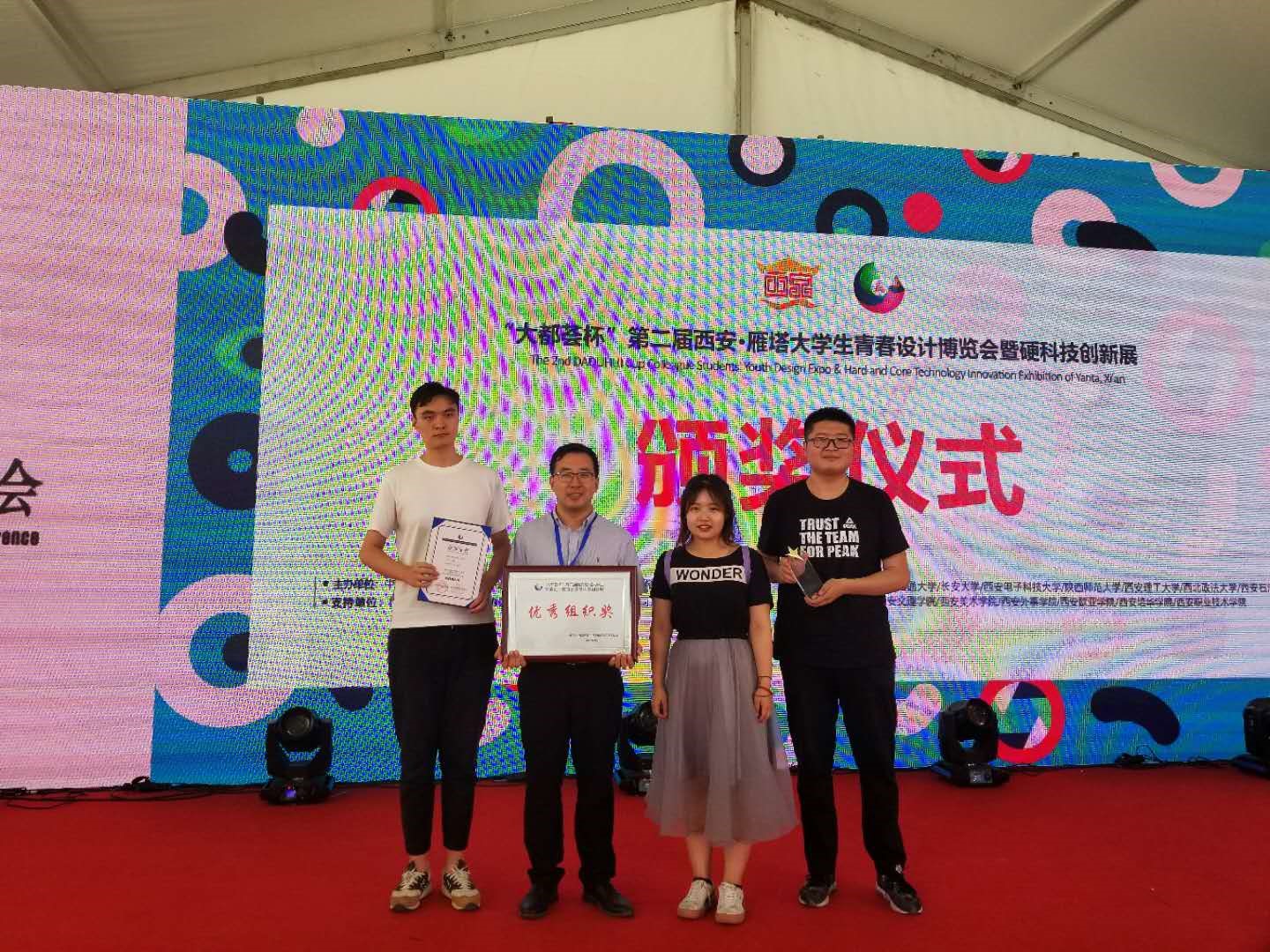 6月11日上午,第二届西安·雁塔老员工青春设计博览会暨硬科技创新展颁奖典礼,于西安大都荟顺利进行,经过层层选拔,最终颁出设计大赛个人奖项95个,创新创业项目PK赛个人奖项12个。其中,公司项目斩获了“遇见未来•创新创业项目PK赛”二等奖和入围奖,以及最具潜力奖;与此同时,公司还获得了最佳组织奖,由校团委副书记尹鹏老师代表学校出席并且领奖,公司员工也在此比赛中表现突出。