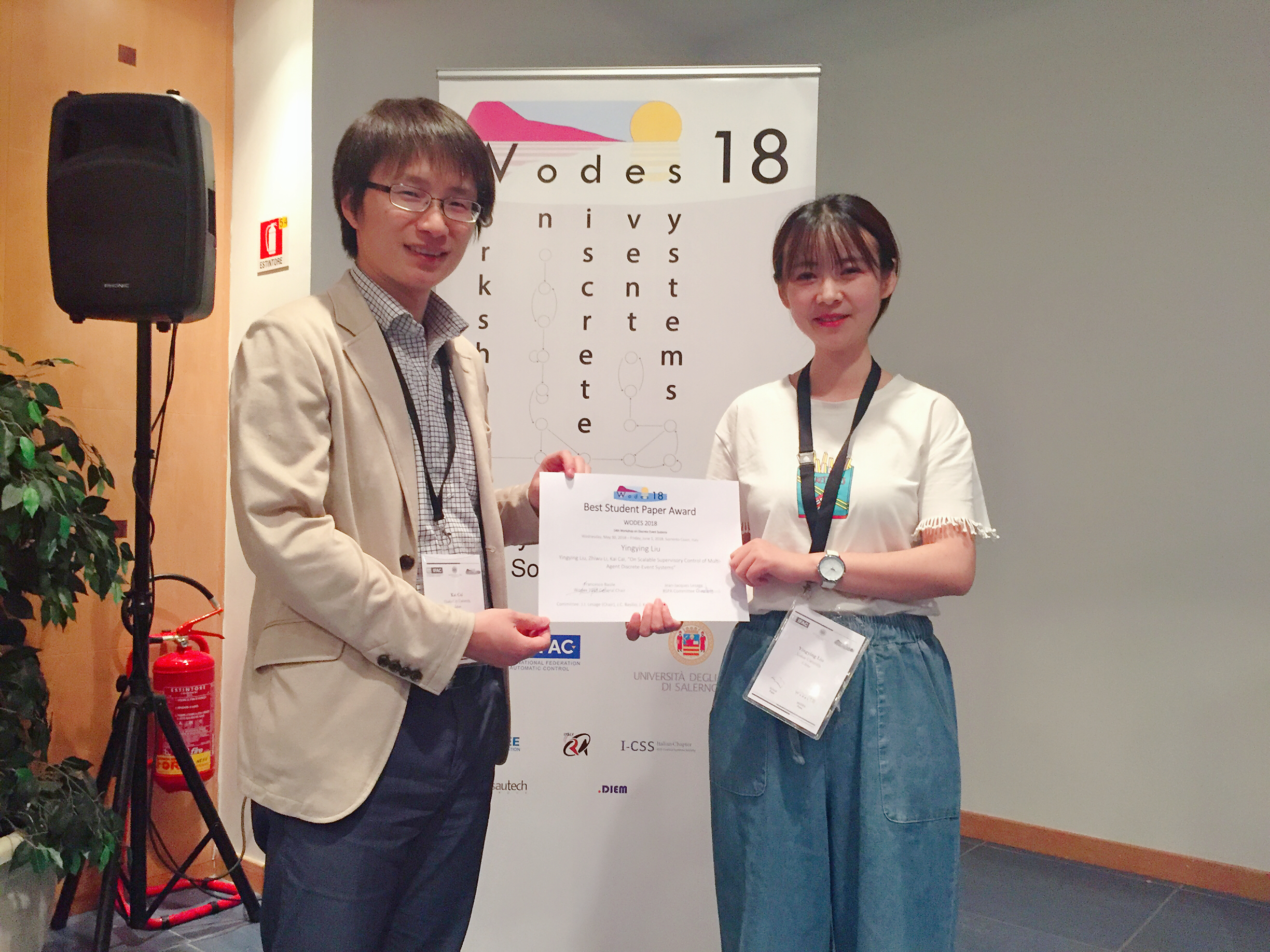 (通讯员 马子玥)5月30日至6月1日,第十四届“离散事件系统国际研讨会” (Workshop on Discrete Event Systems,WODES)在意大利索伦托举行。来自30多个国家的100余名研究人员、青年学者及员工参加了会议。公司2015级博士生刘颖莹同学的论文“On Scalable Supervisory Control of Multi-Agent Discrete-Event Systems”获得“最佳员工论文奖”(Best Student Paper Award)。