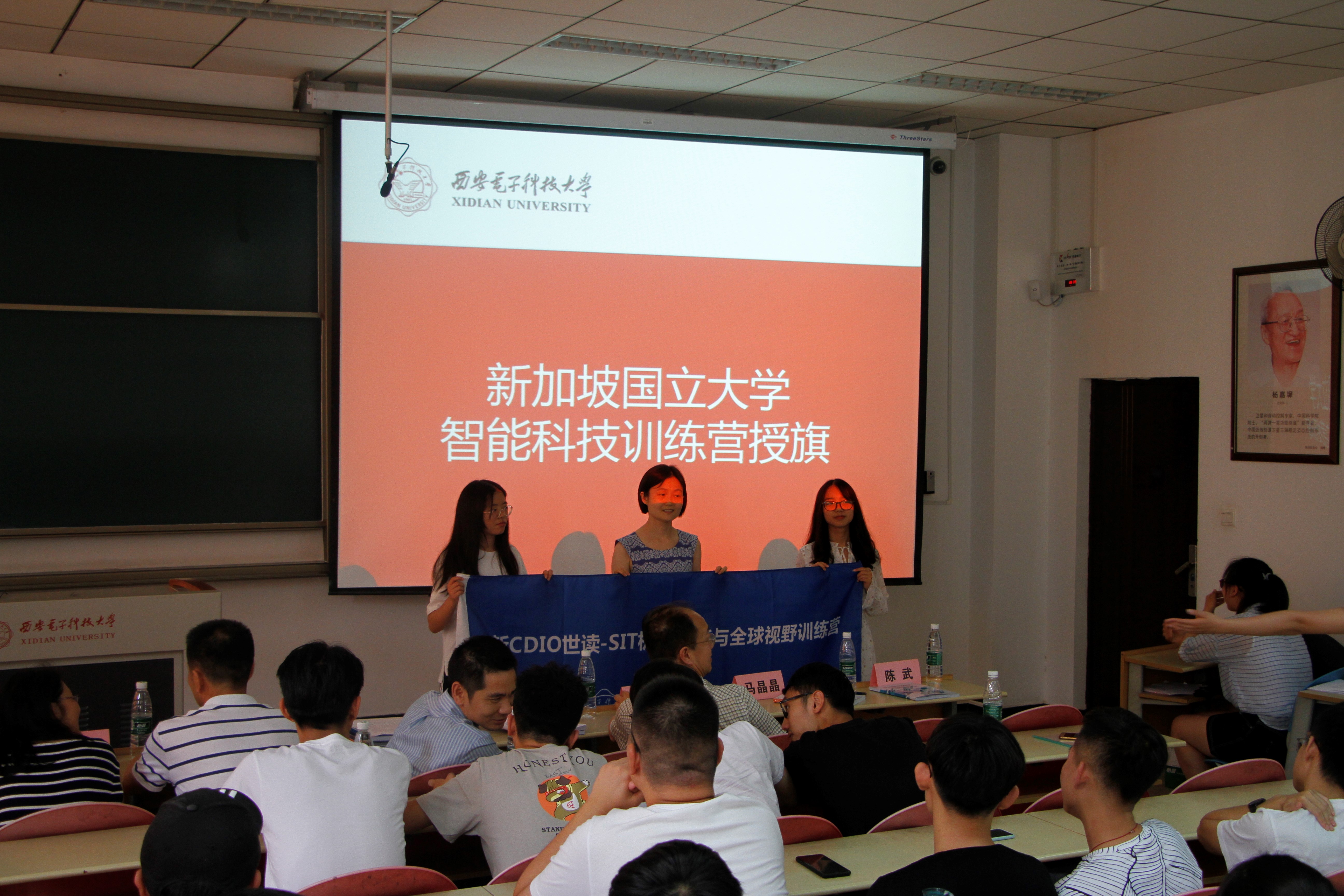 之后由参加2019年寒假新CDIO世读——NUS智能科技训练营的两位同学代表做总结分享,两位同学用生动的PPT及视频资料展示了他们寒假期间在新加坡进行访学交流活动的收获。西电学子在异乡团结一致,积极进取,给参与暑期项目的同学们留下了深刻的印象。之后,各院领导为寒假项目优秀学员颁奖,并为2019CDIO暑期访学团进行授旗仪式,2019年暑期新CDIO世读系列项目正式拉开帷幕。
