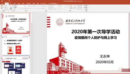 (通讯员 王永坤)2020年3月6日,6776永利集团2018级学业导师王永坤通过QQ屏幕共享为他所指导的18名员工进行了疫情期间的第一次导学。导学的主题为《疫情期间个人防护与网上学习》,在导学中为同学们分享了疫情期间个人防护注意事项,以及如何通过“雨课堂”,“西电学堂”和“学在西电”等网页和app上进行自主学习。