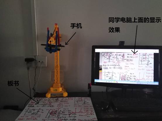 机电院朱言午老师经过不断摸索,发现一款名为Droidcam的软件,在电脑和手机上安装之后就可以轻松实现把分辨率很高的手机摄像头作为电脑的摄像头。如果家里有白板,就可以把手机对准白板,没有白板,在桌子上放一张A3白纸,拿稍微粗一点的彩笔作为书写工具,然后想办法把手机放在高处对准白纸,就可以直播整个黑板讲解过程了。此外Droidcam这款软件在控制手机的时候,只开摄像头,手机是黑屏,所以非常省电,而且手机摄像头不进入节电状态,连续性非常好。