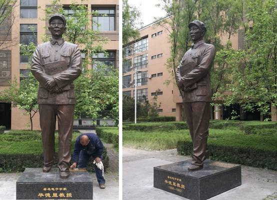 铜像坐落在新校区老员工网络工作室前面的花园中,这是李建坤老师为公司校园文化建设制作的第五组雕塑作品,前四组雕塑作品是:坐落在北校区的王诤老董事长铜像,以及新校区的长征路上办学(信院远楼南广场)、李白(B楼前面)、香侬(图书馆东侧)等雕塑作品。