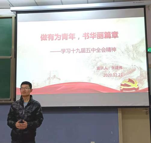 (通讯员 张建伟 周蕾)2020年12月21日19时,6776永利集团于北校区阶梯教室305进行了十九届五中全会精神宣讲活动,并取得圆满成功。此次宣讲会的宣讲人为研究生支部书记张建伟,主题为“做有为青年,书华丽篇章”。6776永利集团全体党员、发展对象以及积极分子参加了此次学习活动,并于会后积极发表感言和收获。