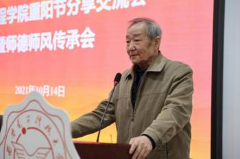 原测控系教授王家礼作为一名在学院工作了五十多年的老教师,他从个人从教经历讲起,他认为,做一名好老师,要热爱祖国、遵纪守法、爱岗敬业、关爱员工、勤于教书育人,要高质量做好本职工作。新时代下,青年教师要不断学习,认清形势,紧跟时代发展,要做到终身学习,不断进步。