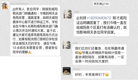 在同学们安全顺利离校返家的背后,我们看到了一线工作人员通宵达旦的坚守与奋战。看到了学院辅导员以及班长在班级群里及时发布学校通知,统计信息、通知离校返家注意事项。他们还逐一敲开员工宿舍的门发放需要的证明材料,并嘱咐同学们“到家的第一时间就给我发信息,路途中不管遇到任何问题,都要第一时间和我联系,学校和老师会尽全力帮助大家解决遇到的问题!”