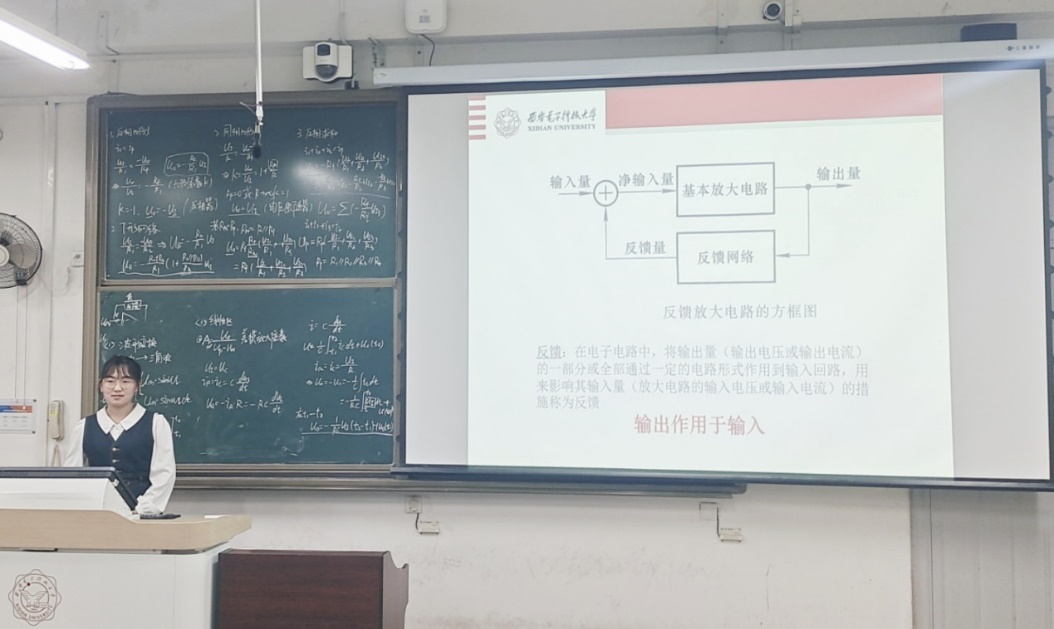 首先由兰新悦同学讲解模拟电子技术基础。她针对放大电路中的反馈,从有无反馈的判断、反馈极性的判断、直流反馈和交流反馈、不同组态负反馈放大电路四个点为核心,带领同学们回顾复习了放大电路中反馈问题的知识点。