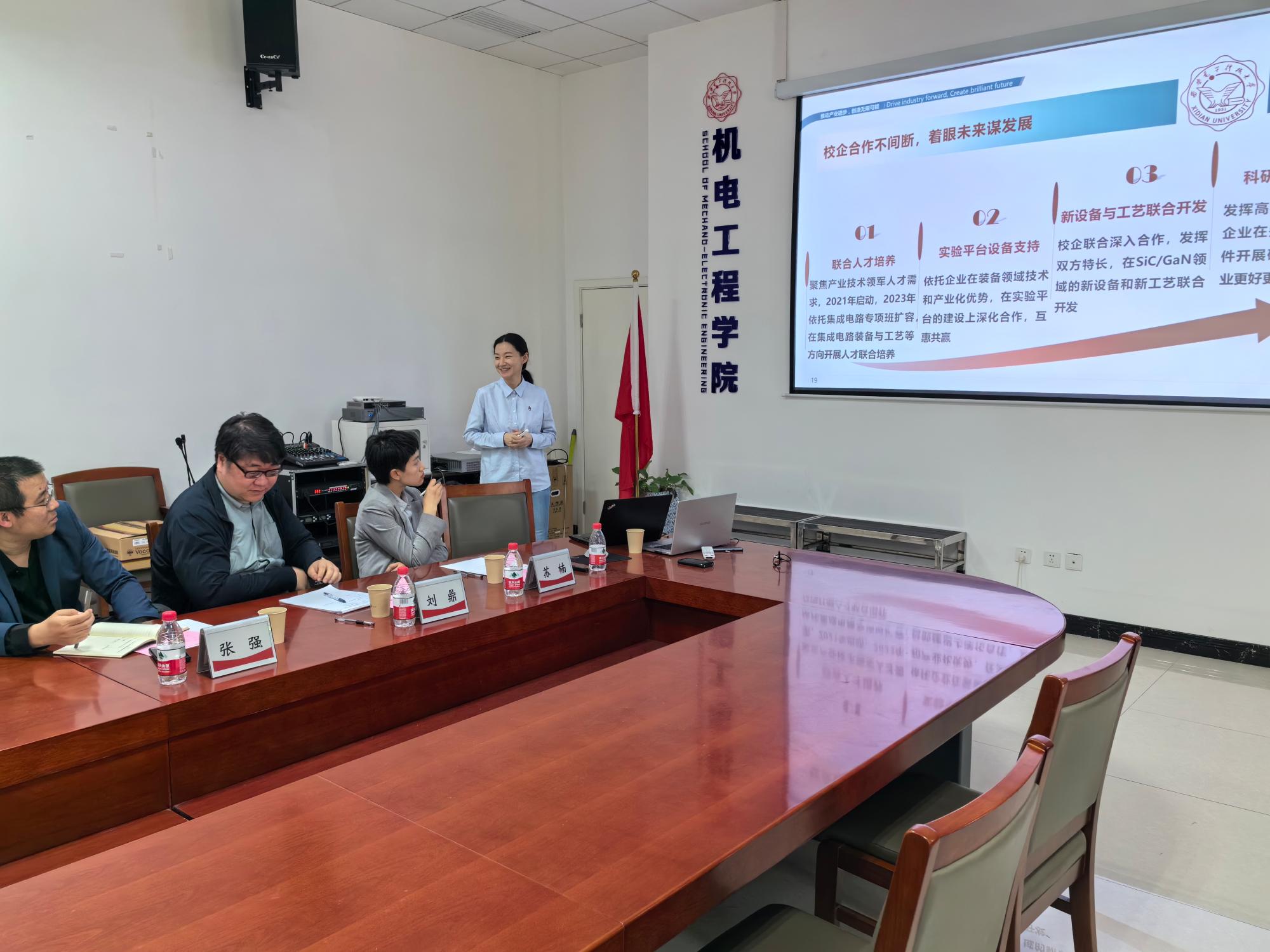 随后,谢谦对学院的热情接待表示感谢,并详细介绍了北方华创的公司概况、与西电的合作历程以及当前校企联合培养的状况。她提到,当前集成电路行业面临人才短缺、培养周期长和内部竞争激烈的挑战,因此希望通过校企合作整合双方资源,推动前沿科技成果的工程转化和研发人才的前置培养,实现学校、企业、教师和员工四方共赢。为此,北方华创已推行“梧桐计划”,初步构建了一套人才培养体系,并邀请对化合物半导体装备有兴趣的学院教师加强技术交流,共同培养更多适应产业发展需求的综合性人才。