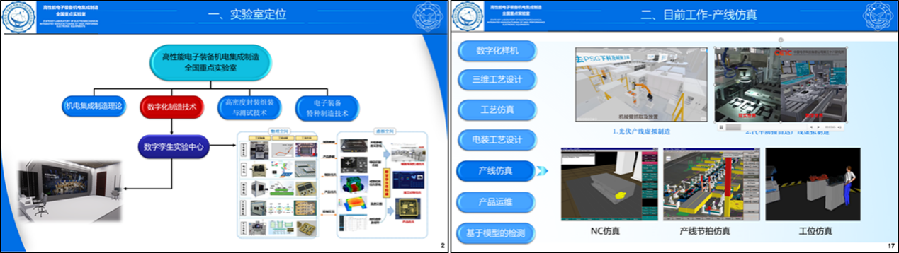 接着,在丰博老师的带领下参观了高性能电子装备机电集成制造国家重点实验室,介绍了邵晓东教授领导的计算机辅助技术研究团队及其负责建设的数字孪生实验中心的定位和在数字化样机、制造工艺虚拟仿真、工业产线仿真等方面的研究成果。来访专家对计算机辅助技术研究团队的研究成果给予了充分的肯定。