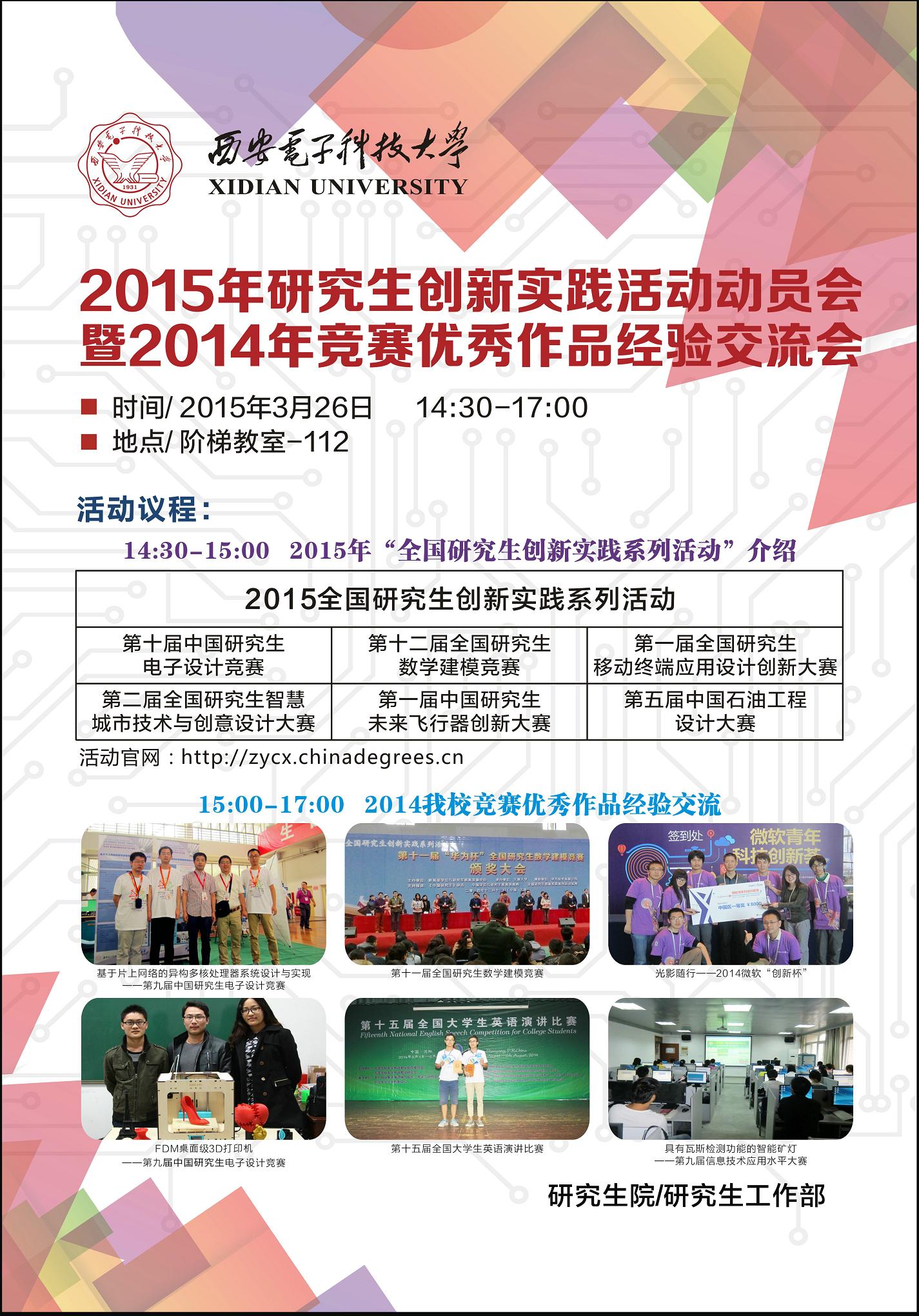 阶梯教室112召开“yl6776永利集团官网2015年研究生创新实践活动动员会暨2014年竞赛优秀作品经验交流会”。届时,将向大家介绍2015年研究生创新实践活动六大赛事的具体情况,并由 2014年度竞赛获奖优秀队伍介绍参赛经验。