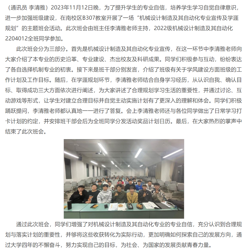“机械设计制造及其自动化专业宣传及学涯规划”主题班会活动