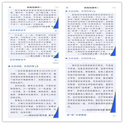 各支部党员在学习的同时,充分利用微信、QQ等网络新媒体平台,以贯彻落实习近平总书记的重要指示和遵守公司党委各项工作要求为主题,每周组织一次线上学习讨论、心得交流活动,教育引导全体党员做坚定信心的表率,做科学防疫的表率,做遵规守纪的表率,做理性思考的表率。学院入党积极分子、预备党员同志面对本次疫情,纷纷向所在党支部提交思想汇报,坚定信念,为抗击疫情加油。